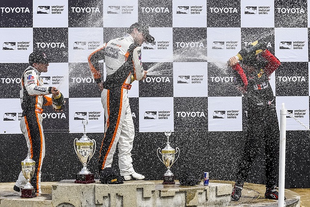 Marco Andretti, Michael Andretti, and Gil de Ferran are on hand to give the "oval rookie" some pointers after Marco was through with the car set-up laps in the orange liveried No. 29 McLaren Honda Andretti Autosport prepared Dallara DW12.